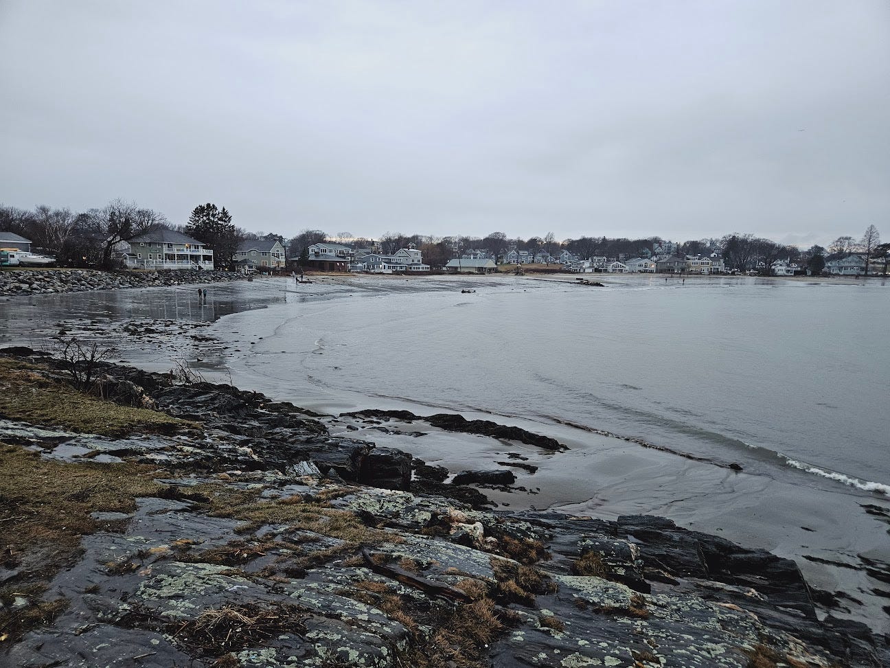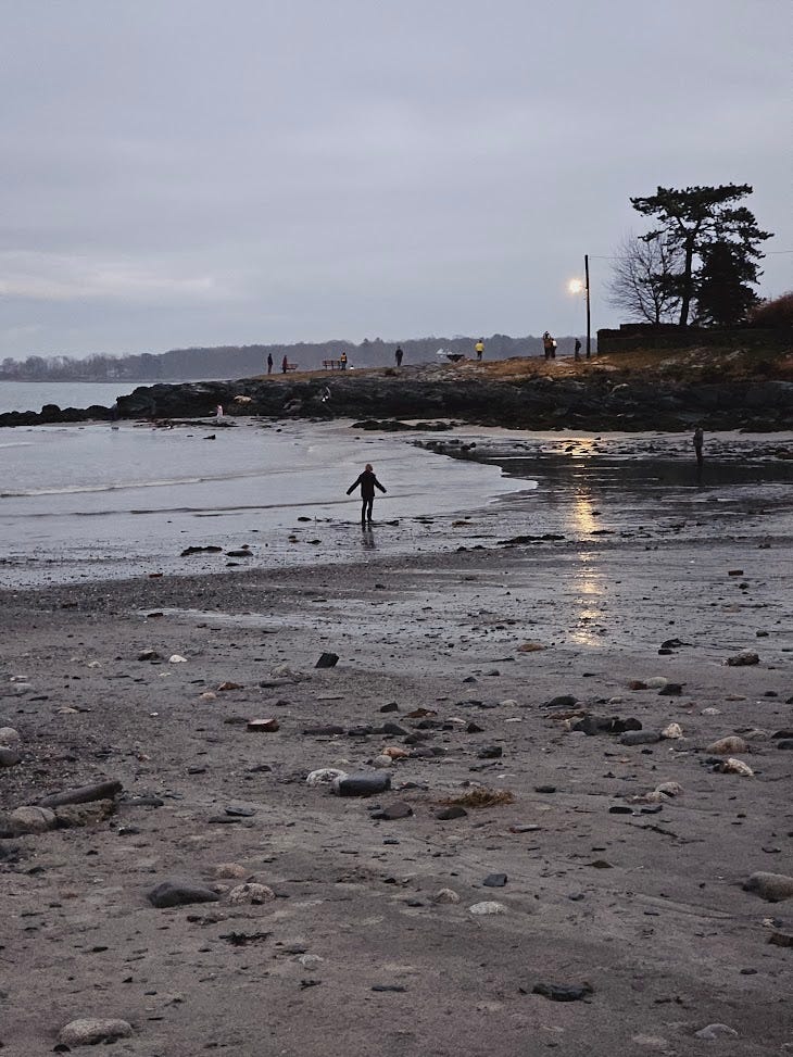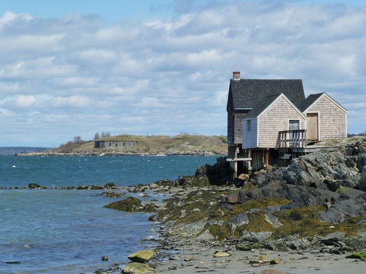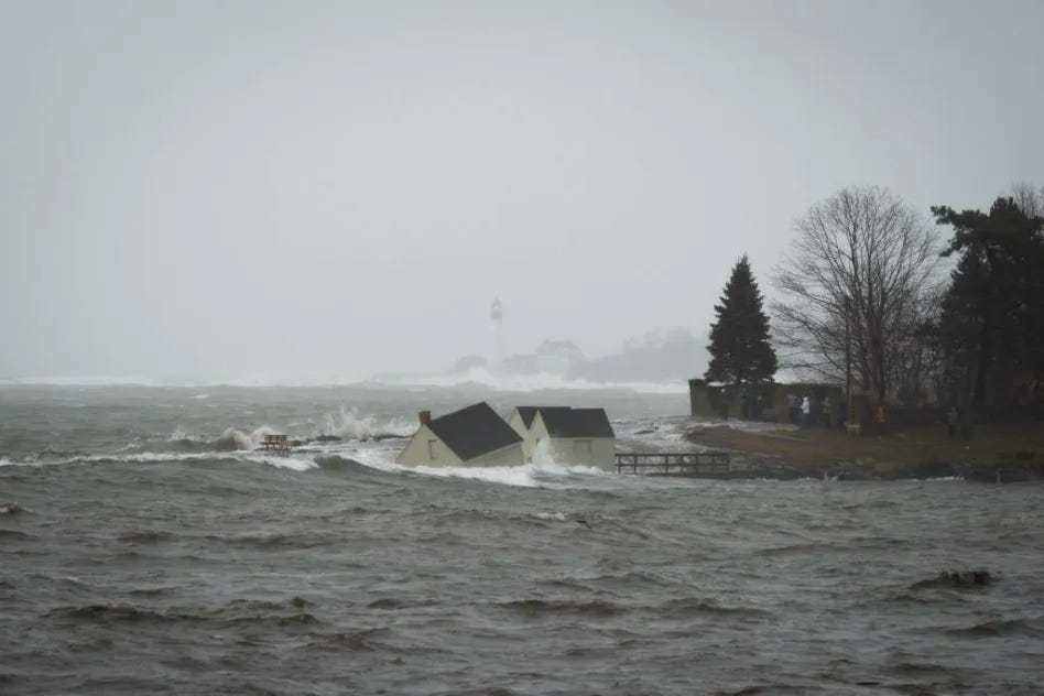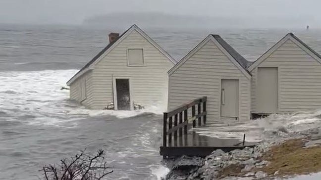 [Today Portland witnessed its highest tides, reaching levels of 14.57 feet. The second highest was the previous record of 14.17 feet set during the Blizzard of 1978, and the recordkeeping began in 1912. This afternoon’s flooding was especially potent as similar flooding occurred only three days ago on the 10th, so many of the usual protections (dunes, seawalls, etc.) were washed out before today’s surge even began. Parks are closed “until further notice” near my home. Most impactful to me is the loss of the three historic fish shacks on Fisherman’s Point at Willard Beach. These shacks have been the destination of my frequent, sometimes nightly, walks in warmer months. Roughly a mile from my home, for years they were the perfect picturesque end goal. Today, around 1pm, all three were claimed by the sea; lifted up off their placements on the point to then float, sink, away from the shore into the bay, into the shipping channel’s depths. Walking over to pay my respects around 4pm, there was scarcely a trace left of them. Some bricks, some chimney fragments, some fragments of wooden beam and concrete slab. They had vanished with the tide. The point was bare, barren. Beautifully so. No scars or gashes. The sea took the shacks away gently. Forcefully, yet without any noticeable damage to the land and rocks they sat upon. Incredible! At first I thought I would feel sad. Then I felt surreal. Then I felt excited, joyous. This land, this place I have known for so long — for my whole life — I now get to have a new, evolved relationship with, a new appreciation for. More of this will happen. Let us welcome it. Let us welcome it all. Every feeling, every sensation, every necessary part that must come undone to make way for what is coming, to make way for the new.