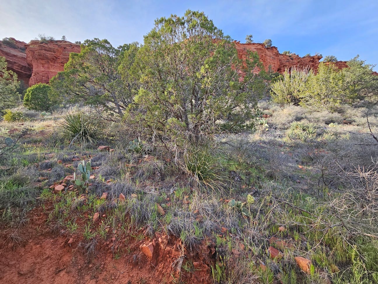 NOTICE THE BEAUTY TO BOLSTER THE FAITH There are a thousand ways to distract yourself With every imaginable horror Addictions to behaviors that cause us stress Anxiety at all the things we can't control Faith is fickle — one moment we trust And then, lost in despair, barely afloat I listen to the quiet music in the background While I sleep — or try to Overheating in the bed, imagination suffused With desert shadow, reds golds greens In miniature scale, every texture multilayered Overlaying my senses my sight I can't stay present with the land Wishes to dispell a wonder which leads Not to bemuse, the candid careen A bit off-course, no less the wiser While I wake — or wander half in dream The sun crosses the sky, shifting light Wanders the landscape, half in dream Half awake, to the changing colors and heft Eyes closed to the splendor, I feel it All around me: the beating pulse Hot breath moving as wind in the branches Burned shrub and brush, prickly pear Red red red, and bright parched green Evolved to survive in feast and famine Flood and drought — stored in the roots Shining skin plump or taut tight stretched Dust kicked up, small lizard scales Tail flickering across the light, noticed Until silence, stillness Is not still — everything is moving While seemingly still, I catch my breath Eyes open again, each an earth In scope magnifying and minifying Surmise the vibrating atomic quant With sunset behind, approaching dark Hours of twilight haze over the valley Reflecting light in bands refracting An instant feels too long today I beg for release from the ecstasy Which too has grown painful In the extreme, I lose track of the vision My faith falls again, fallen sense Downward looking, the ground lifts me up Holding, seeming ease A glittering light below as the night is born Above, beeming down upon me, shattered Into a thousand fragments of light Mosaicized sense, my self reparted Undone merge, back up The data, retrieve the image, store The working files, documented Demented mirror — hope lives in derangement And o-pinions are nobler than they seem Perhaps noblest: so we notice The best and most, the beautiful sublime transcendent To bolster our faith in the unseen mechanisma Even faith is fickle The will is fickle! The strongest held belief will change instantly Plunge and plummet into else otherwise worse. Change is the only guarantee Each movement is reciprocated in intensity We follow the shifts and tend to them Observe and articulate and share in them And the one faint red glimmer reminds us: It has always been worth it. It always is. And will be~