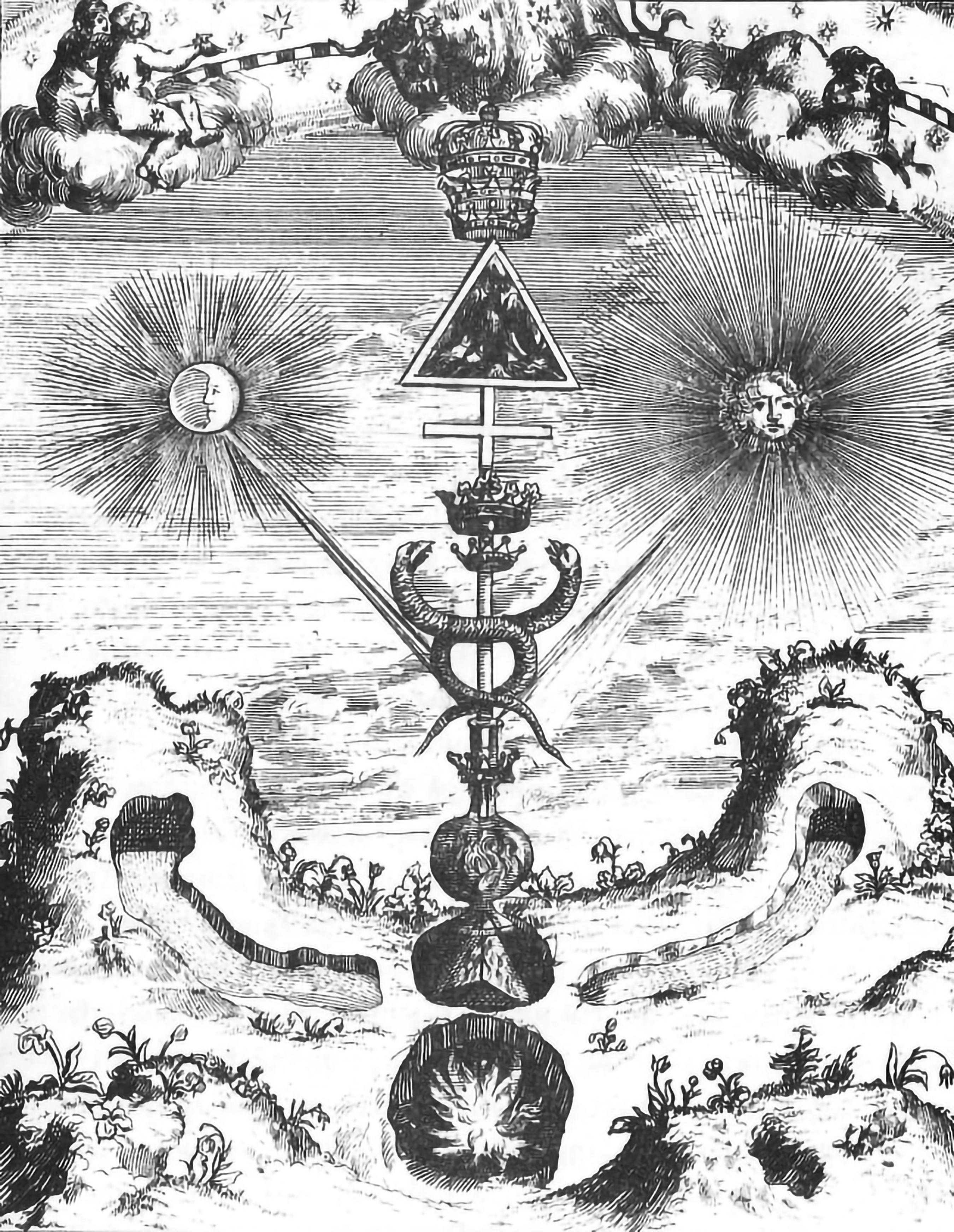 Those that are initiated in the Philosophick Mysteries, will easily and presently comprehend the Sense which is hid under this Figure. But these who have not these Lights, must here consider in general a mutual Correspondence betwixt the Heavens and the Earth, by Means of the Sun an Moon, who are like the secret Ties of this Philosophical Union.