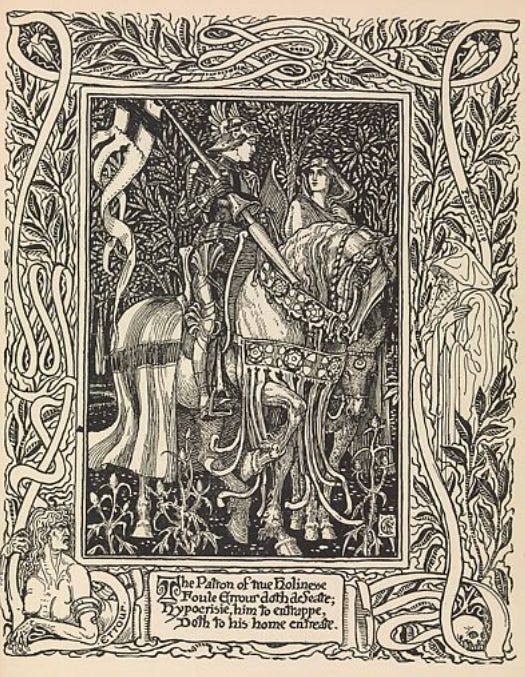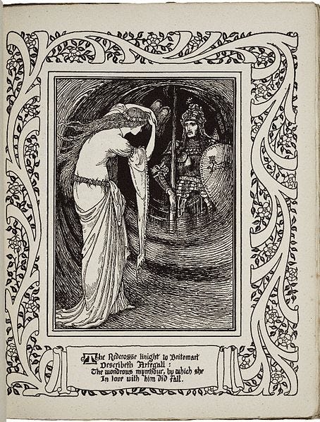 [Edmund Spenser’s Faerie Queene (1590-1596) has been on my mind a lot of late. Chastity features prominent in Book III, centering on the lady knight Britomart, who defeats Guyon (Temperance) in a joust. Britomart then quests to rescue famed Redcrosse Knight (Holiness) of the first Book, meeting the wizards Merlin (with his magic mirror) and Busirane, a poet-magician whom she must defeat in order to liberate the lovely lady Amoret. Like the other parts of this very long tale, the third Book is filled with gruesome imagery. It remains, however, one of my very favorite storylines. Like all good epic poems, the Faerie Queene plays as Merlin’s magic mirror, showing the reader/listener back to themself. One gets lost and found regularly in its verse. We are the rescuer and the rescued, intertwined as Britomart and Amoret become, with a profusion of singular feminine pronouns which at times cannot be distinguished in their reference. And so they are one, as we are one; and they are apart, as we are apart.