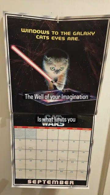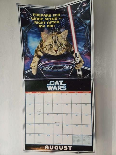 *Paintings are a series by Jean-Léon Gérôme, completed between 1895 and 1898. Photographs are from tonight and are my own, of me and my home, including the exceptional “Star Wars” cat calendar, which I at first derided, and then, after accepting it in, realized it was prognosticative, yet another medium for God to Speak